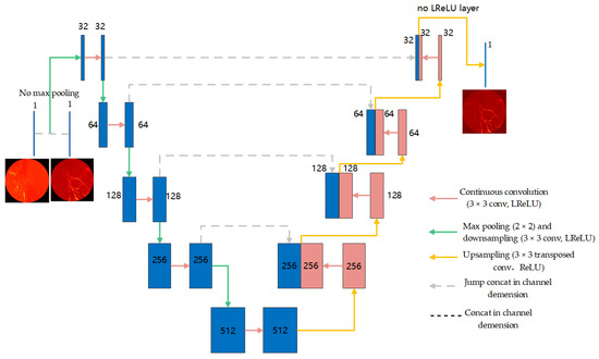 To achieve PAM image transformation, we adopted U-Net as the framework for unsupervised learning. U-Net consists of two parts, called encoder and decoder. The U-Net architecture we used for image enhancement is illustrated in Figure 5. The encoder contains five downsampling convolutional blocks. Each convolutional block comprises a 3 × 3 convolution, with a Leaky Rectify Linear Unit (LeakyReLU, slope = 0.01) layer. There is a max pooling layer at the end of each step. The downsampling operation of the encoder is to extract high-level features of images. The decoder also comprises five steps. Each step consists of an upsampling transposed convolution (to halve the number of feature channels) and a LeakyReLU layer. In addition, a 3 × 3 convolution and a LeakyReLU layer are added to each step of the encoder and decoder as continuous convolution to strengthen the capacity of the model. The jump concatenating enables the decoder to get the high-level features extracted by the encoder. On the last layer of the decoder, a 1 × 1 convolution is employed to map each 32-component feature vector to the desired number of classes, without any activation function followed.