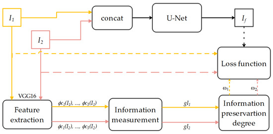 To preserve structural information in each source image, two adaptive weights, named and , are used to define the similarity between the source images and the fusion images. A higher weight corresponds to a greater similarity, indicating a higher degree of preservation for the corresponding source image. and are defined as follows: