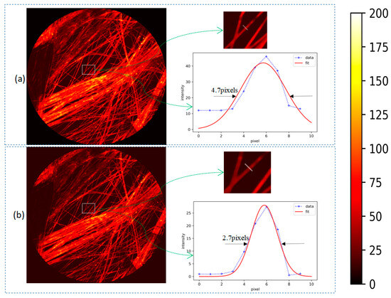 To assess the lateral resolution of our system, we employed carbon fibers for imaging, each with a diameter of 7 μm, affixed to a transparent glass sheet. The carbon fibers were fixed on a transparent plastic disc and immersed in the water tank to avoid displacement during the imaging process. As illustrated in Figure 7, we sampled 10 pixels for (a) and (b) along the white line and performed Gaussian fitting, respectively. The image reconstructed by max projection has higher pixel intensity while lower lateral resolution than that of deep learning in general. The FWHM of the Gaussian function and lateral resolution can be calculated by the following formulas:
