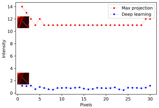 Then, we extracted 30 pixels from the two images in the same position along the white lines in Figure 8. The pixel intensity distributions of the images reconstructed by max projection and deep learning are also depicted in Figure 8 for comparison. It is obvious that the image reconstructed by deep learning has a lower intensity compared to that of max projection. In other words, the former has a lower impact of background noise than the latter, indirectly implying that the image reconstructed by deep learning boasts higher contrast than that of the max projection.