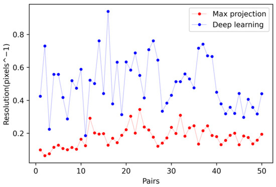 In order to evaluate the effectiveness of our algorithm, we used 50 pairs (divided into 10 pairs, each containing five samples) of carbon-fiber images (300 × 300 pixels2) for the resolution test. If the resolution of the image reconstructed by deep learning outperforms the one reconstructed by max projection, the algorithm of deep learning is considered to be effective. Effective rate means the ratio of the number of effective pairs to that of the total (50 pairs). The FWHM values of both the images reconstructed by max projection and those by deep learning are given in Table 2. The reciprocals of the data in Table 2 were calculated and are illustrated in Figure 9.