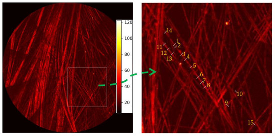 To evaluate the imaging accuracy of our system, a planar standard part made of carbon fiber with a fixed diameter of 7 μm was used for imaging. We imaged the standard part and compared the width of the carbon fiber (FWHM) in the image with the actual width of the carbon fiber (7 μm), which could reflect the imaging accuracy of our system to some extent. Fifteen groups of data were sampled from the image, as shown in Figure 10 and Table 3. The average value of the measurement results (8.406 μm in Table 3) is 1.406 μm larger than the actual size (7 μm).