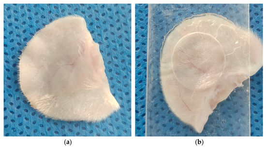 Images of a mouse ear in vitro. (a) The mouse ear with hair intact. (b) The mouse ear caught by two plastic sheets.
