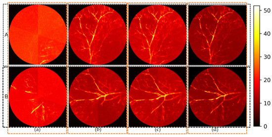 In summary, the images reconstructed by deep learning exhibit a lower intensity distribution but higher contrast. It is intuitively observable that the vasculature images in column (d) are clearer than those in column (c). Column (c) exhibits higher intensity, causing the background to appear brighter and the vasculature to appear blurred. Therefore, images in column (d) have a better performance compared to those in column (c).