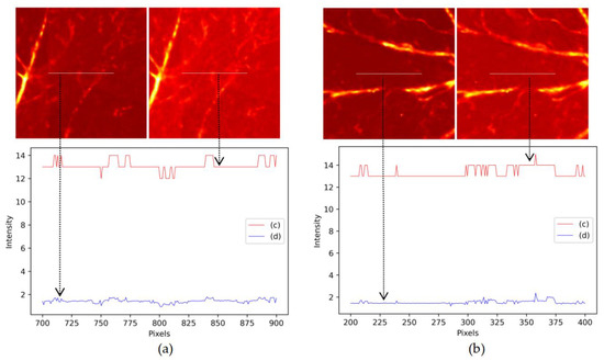 (a) The comparison of the background noise of the images in row A; the average intensities of the background noise of (c) and (d) are 13.12 and 1.43, respectively. (b) The comparison of the background noise of the images in row B; The average intensities of the background noise of (c) and (d) are 13.35 and 1.52, respectively.
