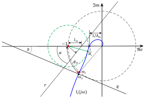 - Inequation for the fulfillment of the linear margin by each ELTF similar to optimization I but with two differences: the linear margin is now a decision variable; and, in addition, this constraint is now only required for frequencies higher than ωx. For lower frequencies, it is not required to be to the right of line r in Figure 3 since the previous constraint renders the Nyquist plot of the ELTF to be below the line q defined by β and tangent to the unit circle for frequencies below ωx. This constraint also causes the polar trace to move away from the critical point −1;