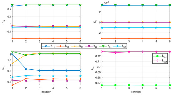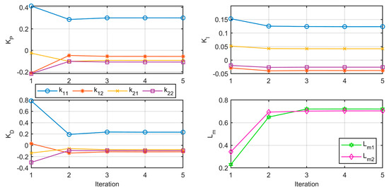 - If the termination condition is fulfilled, the design is accepted and the resulting vector ρ is used to generate the multivariable PID control matrix K(s); otherwise, the iteration variable m is incremented and the process iterates again. The termination condition is satisfied if, during three consecutive iterations, the variation of the decision variables is below a user-defined tolerance. A maximum number of iterations before the process stops in the case of no convergence is also defined.
