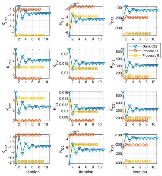 - The complete design of the entire control matrix is formulated at each iteration as a single linear programming problem in which the frequency response of the ELTFs and the open-loop transfer functions are linearly parameterized with respect to the PID parameter vector. In this way, a better convergence is sought. In our previous work, each column of the controller matrix was separately designed;
