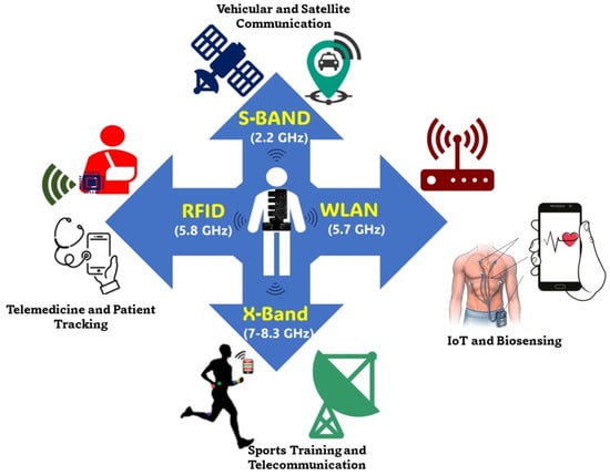 Wearable and flexible electronics have garnered significant interest across industrial and academic sectors, providing versatile applications for personal use, the Internet of Things (IoT), sports, military applications, RFID (radio-frequency identification), medical body area network (MBAN), and beyond [1,2]. A visual representation of these applications is depicted in Figure 1.