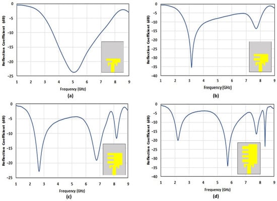 To minimize the patch size, a comb-based slotting strategy is incrementally introduced, as illustrated in Figure 3a–d. This figure showcases the progressive design evolution of the proposed antenna, illustrating the contribution of each “tooth” in the radiating patch to achieve distinct frequency bands. Initially, the antenna’s radiating patch features a single tooth, resulting in a single-band resonance at 5.0 GHz.