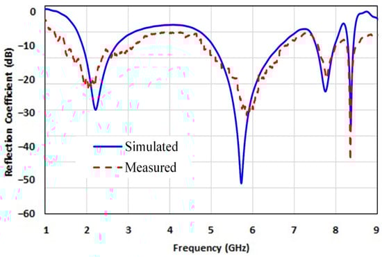 The antenna produces a reflection coefficient consistently below −10 dB, indicating effective impedance matching, as depicted in Figure 3. The achieved quadruple bands showcase favorable impedance matching characteristics, resulting in bandwidths of 0.554 GHz (1.990–2.544 GHz), 1.188 GHz (5.217–6.405 GHz), 0.316 GHz (7.584–7.901 GHz), and 0.108 GHz (8.306–8.415 GHz), respectively.
