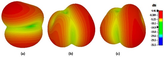 Illustration of the simulated 3-D radiation pattern at 5.7 GHz, showcasing (a) , (b) , and (c) orientations.