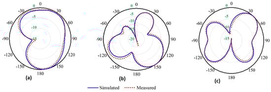 Figure 6 presents a comparison between the measured and calculated reflection coefficient results. The analysis reveals a close alignment between the calculated and measured return loss, consistently maintaining values well below −10 dB. The minor frequency variation observed may be attributed to slight discrepancies in the fabrication of the prototype antenna design. Additionally, factors such as the soldering process and temperature fluctuations during the connection of the SMA connector to the antenna could subtly influence the measured results.