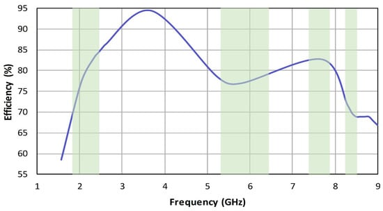 The antenna efficiency indicates how effectively input power is converted into radiated electromagnetic energy. It signifies the antenna’s ability to function with minimal losses, providing insight into its overall performance in capturing and radiating electromagnetic waves. Higher efficiency implies that a larger portion of the input power is effectively utilized for signal transmission or reception, while lower efficiency suggests a greater proportion of power is lost as heat or in other non-radiative forms. Efficient antennas are crucial for optimizing communication systems, ensuring reliable signal transmission, and minimizing energy waste. Figure 9 illustrates the quantification of antenna efficiency, showcasing corresponding values of 82.5%, 77%, 82%, and 70% at 2.2, 5.7, 7.7, and 8.3 GHz, respectively.