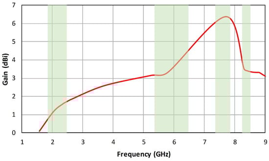 Antenna gain represents the measure of how well an antenna focuses its radiated power in a specific direction. A higher gain indicates more effective signal transmission or reception in the desired direction, which is particularly important in communication systems where signal strength and directionality play a crucial role. The antenna’s attained gain is depicted in Figure 10. The figure clearly indicates that the antenna demonstrates gains of 1.4 dBi and 3.3 dBi at 2.2 GHz and 5.7 GHz, respectively. Notably, the peak gain reaches 6.3 dBi at 7.7 GHz, while 8.3 GHz yields a gain of 3.5 dBi.