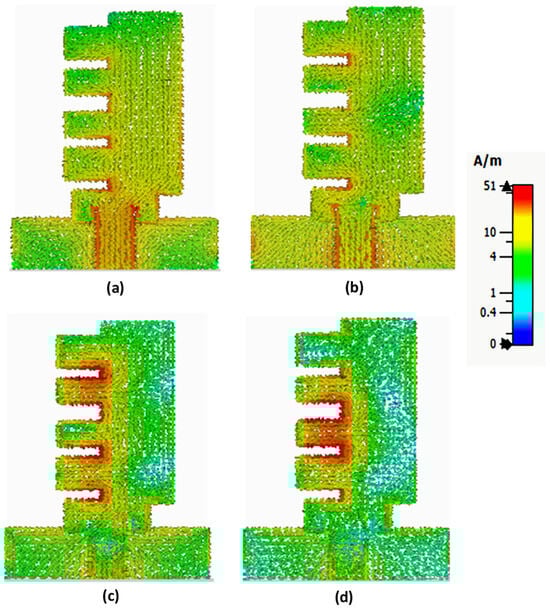 In the instance of lower frequencies, like 2.2 and 5.7 GHz, the antenna facilitates the current to travel along a lengthier path around the periphery, as illustrated in Figure 11a,b. Noticeably, as we move towards higher-frequency bands, a distinct rise in current concentration is observed at the center of the antenna. This is due to the skin effect at high frequencies, causing the current density to be confined to the edges of the teeth, as depicted in Figure 11c,d. Moreover, as the current distribution becomes concentrated in a smaller space at higher frequencies, the antenna manifests a compact size, providing additional evidence that smaller antennas tend to yield higher resonant frequencies.
