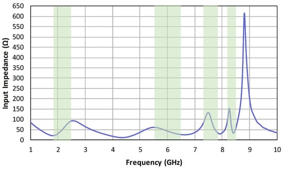 The antenna displays impedance variation across different bands; nonetheless, upon closer examination, this fluctuation remains within the 50-ohm range, affirming satisfactory matching characteristics. Figure 12 visually represents this finding.