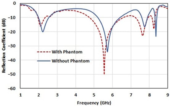 Figure 13 illustrates the comparison of the antenna’s reflection coefficient in free space and when mounted on a tissue phantom. The results exhibit a close agreement with each other. The observed minor drift is quite expected, as antennas tend to behave differently when loaded by a dispersive medium such as a tissue phantom. This behavior is reflected in the observed drift in the reflection coefficient, as evident in Figure 13.