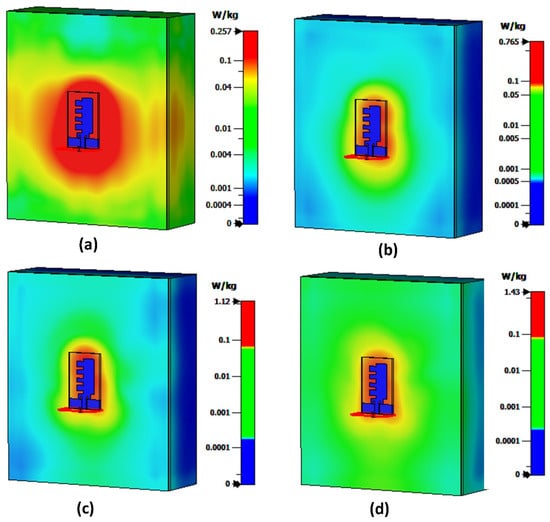 SAR1g values at (a) 2.2, (b) 5.7, (c) 7.7, and (d) 8.3 GHz frequencies.