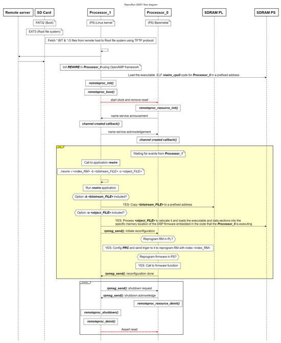 In SDR1, one of the cores of the ARM A9 (processor 0) hosts a bare-metal application linked with a partial bitstream and other necessary ReproRun functions that enable the run-time firmware reconfiguration, whereas the other core, Processor 1, hosts the Linux distribution of Analog Devices. The native version of the AMP framework was only applied in SDR1 since the architecture of the FPGA device in SDR2 does not favor its full use. For this reason, ReproRun was designed in a different way in the case of SDR2, since processor 0 was implemented using a MicroBlaze soft microprocessor IP core, while processor 1 was represented by a host processor. As a result, the REWIRE controller in SDR2 features a subset of the functionalities of its SDR1 counterpart.