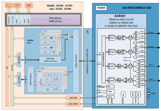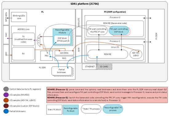 - Hosny, S.; Elnader, E.; Gamal, M.; Hussien, A.; Mostafa, H. Multi-Partitioned Software Defined Radio Transceiver Based on Dynamic Partial Reconfiguration. In Proceedings of the 2020 IEEE International Symposium on Circuits and Systems (ISCAS), Seville, Spain, 12–14 October 2020; pp. 1–4. [Google Scholar] [CrossRef]