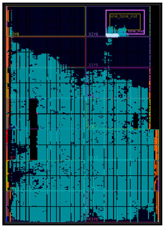 A view of the implementation results after placement and routing featuring a single RR are shown in Figure 6 and a breakdown of the resources’ usage in Table 1. It reveals that the FPGA implementation is low-dense and occupies a relatively small amount of the total resources, leaving the possibility of having more than one RR.