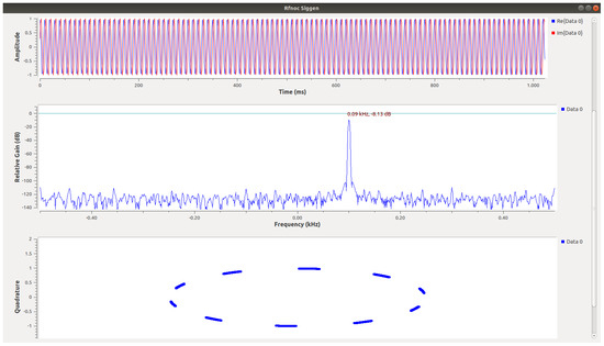 The static FPGA design (static bitstream) is the combination of the modified RFNoC Verilog firmware and the HDL code of ReproRun. Two counters were developed to show the uninterrupted operation of the static bitstream (i.e., counting up and down) and their operation was mapped to a Xilinx virtual input–output (VIO) IP core to monitor them in real-time. In order to demonstrate the partial reconfiguration, we have selected the rfnoc_siggen.grc GNU radio companion (GRC) example for RFNoC (Figure 8). This GRC RFNoC example uses a coordinate rotation digital computer (CORDIC) function to produce a sinusoid in the FPGA device of SDR2 and then passes the I and Q samples to the host PC, where the samples are processed and visualized in the GRC project (e.g., time and frequency domain analysis); some user set parameters, such as the digital gain of the signal, can be manually modified from the host PC.