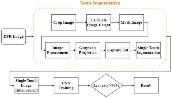 The primary objective of this study is to utilize image processing alongside AI models to identify the relative positions of impacted teeth and the inferior alveolar nerve (IAN) within DPR images. The flowchart of this study is depicted in Figure 2 and consists of three stages: tooth segmentation, image enhancement, and CNN training. Tooth segmentation aims to identify the images of impacted teeth and the IAN. This stage uses algorithmic image segmentation, and YOLO_V4 object recognition to locate pathological positions. Image enhancement methods are employed to highlight the relative positions of the IAN and impacted teeth. Medical X-ray images for this study were not readily available, so a database augmentation technique was used to expand the image database. The training of a CNN model is an effective approach for object classification, and further enhancements can be achieved by fine-tuning hyperparameters and optimizing the model. It determines whether the images containing impacted teeth overlap with the IAN and outputs the result if the model training accuracy is over 90%.