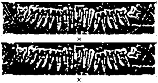 Binarization is the conversion of a grayscale image into a binary image [32], which contains only two pixel values, typically black and white. This transformation highlights the objects of interest in the image, facilitating subsequent analysis and processing. This study adopts a widely used image binarization method known as Otsu’s method. This method relies on an automatically selected threshold that categorizes the pixels in the image into the foreground (the target objects) and the background (everything else). Otsu’s method effectively accomplishes the conversion of an image into a binary image and performs admirably in various scenarios, as shown in Figure 6.