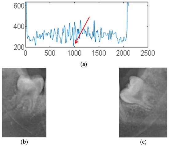 Vertical grayscale projection algorithm (a), vertical grayscale projection, (b) left impacted tooth, and (c) right impacted tooth.