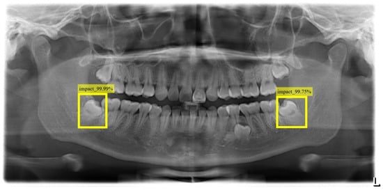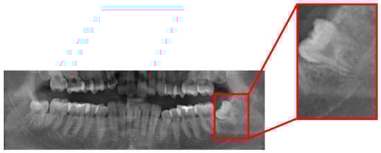 In the fields of medical imaging and oral surgical procedures, precise localization and identification of anatomical structures are of paramount importance. This is particularly evident when dealing with impacted teeth. Dentists must have a clear understanding of the patient’s oral condition before performing oral surgical procedures, especially for the precise positioning of the teeth and their proximity to the inferior alveolar nerve. Accurate positioning and identification not only contribute to surgical success but also reduce patient risk and discomfort. One such scenario involves impacted third molars, commonly known as wisdom teeth, which fail to erupt normally due to insufficient space in the jawbone [20]. The affected lower wisdom teeth may still be partially covered by soft tissue and unable to grow normally, as shown in Figure 1. The mandibular third molar may result in complications such as cysts and tumors [21], which can lead to nerve injuries, given the proximity of the lower third molars to the inferior alveolar nerve. Therefore, accurate knowledge of the location of the impacted tooth and its relative proximity to the inferior alveolar nerve (IAN) becomes critical during impacted tooth extraction surgery. In recent years, the development of computer vision and deep learning technologies has provided new avenues for addressing this challenge, including the application of techniques such as YOLO [22], Faster R-CNN [23], and image preprocessing algorithms. The integration of these techniques allows for accurate identification of the distance between the impacted tooth and the inferior alveolar nerve. It helps reduce potential nerve damage and improves the efficiency and safety of oral surgery.