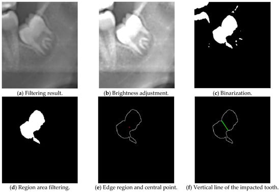 Boundary detection is employed to determine the inclination direction of the impacted tooth. Firstly, the distances between these boundaries within the region of interest is calculated. Subsequently, the shortest line among all possible lines passing through the center point of the region is selected, as shown in Figure 10f. The shortest line typically represents the connection between the top and bottom of the tooth crown. By determining the slope of this line, the inclination direction of the impacted tooth could be ascertained.