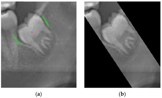 Masking result: (a) lines on both sides of the impacted tooth and (b) the mask for the adjacent non-impacted tooth area.