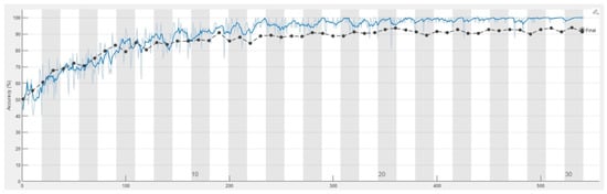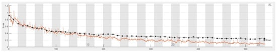 This section presents the performance of the proposed CNN model and compares it with the methods proposed in other studies [36]. Additionally, an advanced symptom enhancement method is analyzed. The comparison of the four CNN networks is presented for further discussion of the results. The CNN models are validated by the accuracy rate of both the validation set and the testing dataset. Table 5 provides details about the training process of ShuffleNet, and the specific training steps are shown in Figure 12 and Figure 13. Furthermore, the confusion matrix, as shown in Table 6, is calculated based on the network model. This study’s training results are divided into whether the impacted tooth touches the inferior alveolar nerve. Equations (4)–(6) demonstrate the commonly used metrics for training, including accuracy, recall, and precision.