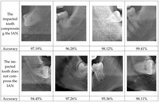 In this study, a single tooth testing image is obtained using images from a non-training database as shown in Figure 14. Table 9 shows the diagnostic accuracy of whether the IAN in Figure 14 is extruded by an impacted tooth. The accuracy of ShuffleNet reached 93.90%, and the judgment accuracy of the other three models also exceeded 90%. There was a significant improvement of over 6% compared to the technique in reference [36].