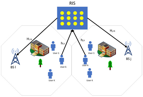 The explosive growth of mobile data, as well as the emergence of innovative technologies such as virtual reality and holographic communication, requires future wireless communication systems with extremely high data rates, seamless coverage, and ultra-high reliability [1]. In the past few years, wireless communication systems have expanded the coverage and increased the user rate by continuously increasing the size of the base station (BS) antennas, which will lead to inter-antenna interference and carries great hardware costs. Fortunately, reconfigurable intelligent surfaces (RISs) can enable future wireless communication systems to meet these requirements [2,3,4]. Therefore, RISs have been widely studied [5,6,7,8,9,10]. The authors in [5] focused on the RIS-aided multicell multiple-input single-output (MISO) system and maximized the minimum weighted signal-to-interference-plus-noise ratio (SINR) by jointly optimizing the transmit beamforming vectors at the BS and the reflective beamforming vector of the RIS. The authors in [6] investigated a RIS backscatter-based uplink coordinated transmission strategy and aimed to maximize the weighted sum rate (WSR). In [7], the authors suggested an RIS be deployed at the boundaries of multiple cells to mitigate inter-cell interference and assist cell-edge users in communicating with the BS, aiming to maximize the WSR by jointly optimizing the phase shifts of the RIS and the precoding matrix at the BS. In [8], the authors considered the phase shift design of the RIS and joint user scheduling in RIS-aided multicell downlink systems. The authors in [9] studied an intelligent omni-surface-aided multicell MIMO communication system and designed a distributed hybrid beamforming scheme to maximize the sum rate. In [10], besides considering the joint beamforming problems for an RIS-aided multicell MISO system, the authors further considered the SINR balancing beamforming design to enhance the fairness of users by maximizing the minimum SINR among all users.