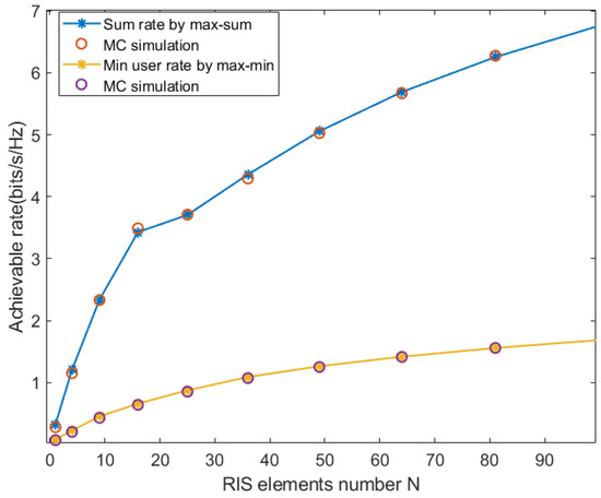 As shown in Figure 2, we plot the achievable rate obtained from optimization problems (32) and (33) and carry out MC simulation for verification. The MC simulation results are consistent with the derived results, which shows the accuracy of the derived results.