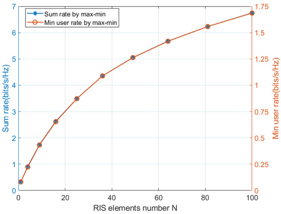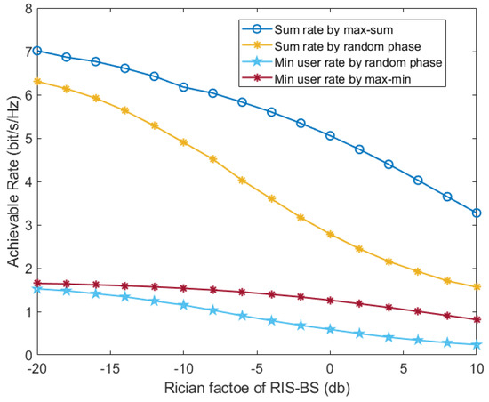 In Figure 5, we plot the achievable rate versus the Rician factor of the RIS–BS channel. As increases, the sum and minimum user rates decrease. This is because, with the increase in , the channels between users have a stronger correlation, which reduces the spatial multiplexing gain and also increases the interference between users.