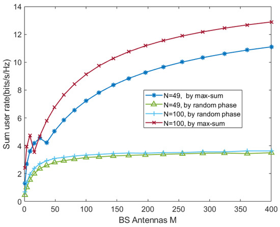 Figure 4 depicts the achievable rate in different scenarios. As shown in Figure 4, scheme ‘, Sum rate by max-sum’ is superior to scheme ‘, Sum rate by random phase’, and, as N increases, the performance gap between the two will become larger. This is consistent with our Corollary 2, i.e., the rate will tend to be constant when BS antennas . Moreover, it indicates that it is necessary to optimize the phase shifts of the RIS.
