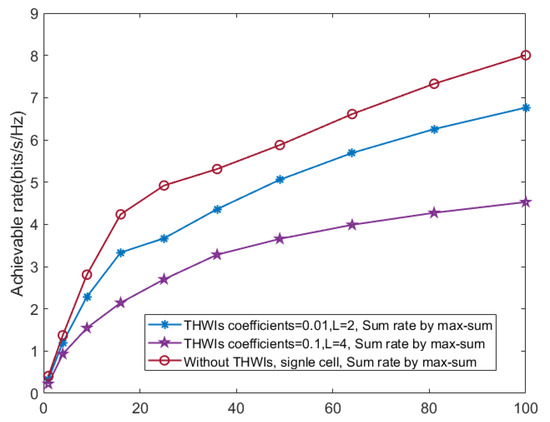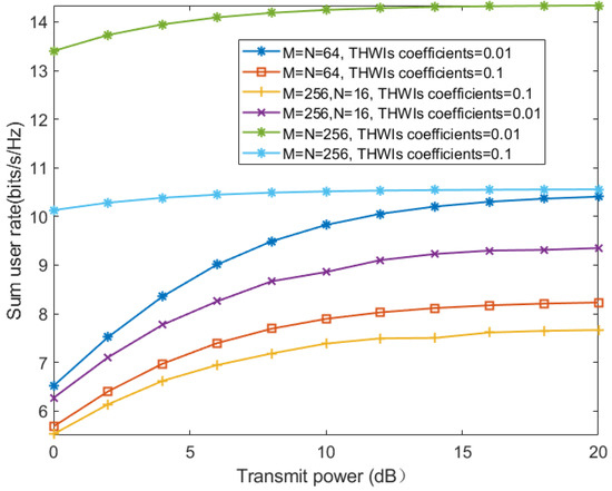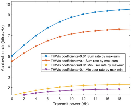 In Figure 6, we plot the achievable rate with different THWI coefficients. As the transmit power increases, the sum rate and minimum user rate gradually increase and tend towards a limit value. In addition, with the increase in power, the performance gap between the two THWI scenarios also widens because the THWIs are tightly coupled with the transmitted signal and become stronger as the THWI coefficients increase.