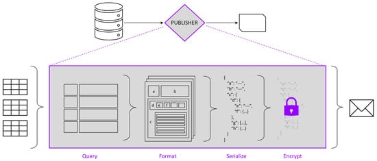 Figure 2 shows Dataphos Publisher’s process, which begins with reading data from an on-premises database. The data are queried and formatted, creating a business object before transferring the data to the cloud. Once the business object is created, the data are serialized, encrypted for security, and sent to a message broker (a mediator between two services able to handle large volumes of data [9]), where they can be pulled by cloud services. The procedure described allows for a constant flow of ready-to-digest data packages to the cloud, and all at a fraction of the cost. This process (i.e., data ingestion) is integral to the whole system because it sets the foundation for downstream data processing, analysis, and reporting, which are essential for decision making in a timely and accurate manner.