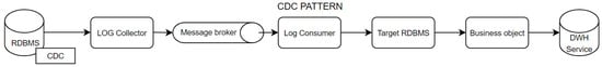 A flow diagram illustrating the Change Data Capture (CDC) data architecture pattern. The pattern begins with a Relational Database Management System (RDBMS) in which CDC is applied to capture changes. These changes are collected by a LOG Collector and passed to a Message Broker. The Message Broker then routes the set of messages to a Log Consumer, which processes the data and applies it to a target RDBMS. Finally, the processed data are used to update business objects which can be utilized by data warehouse (DWH) services for analytics and reporting.