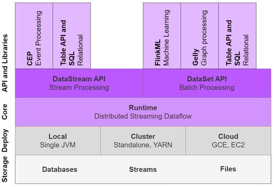 The core of Flink is the distributed dataflow engine which executes dataflow programs. Flink’s runtime program is a DAG of stateful operators connected with data streams. The two core APIs of Flink are the DataSet API, used in batch processing, and the DataStream API, used in stream processing [32]. The core runtime engine (the green square in Figure 6) serves as an abstraction layer for the two APIs. On top of the core level, Flink combines both domain-specific libraries and APIs [13,41].