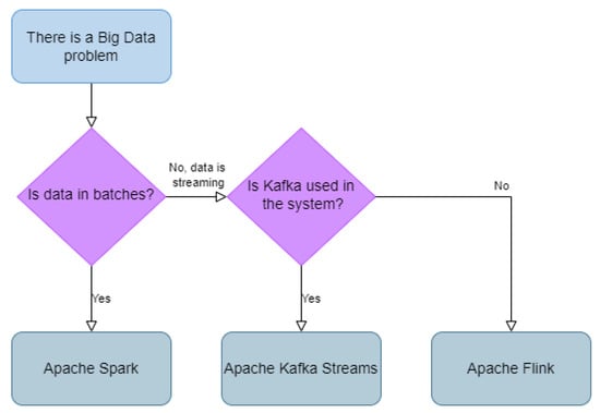 A flowchart for the selection of the optimal data processing tool. The selection process starts with a big data problem. If the data are being ingested in batches, then Apache Spark would be the most suitable solution out of the three data processing tools covered in this paper. However, if the data are streaming, then the data processing tool would be chosen based on which message exchange system is used; if it is Kafka ecosystem, then we would suggest the Apache Kafka Streams tool, and if there is no Kafka in the system, we recommend Apache Flink.