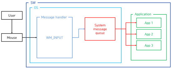 To support interaction between the user and the computer, the operating system provides features such as moving and clicking the mouse cursor based on mouse data sent from the mouse device. Among the mouse data functions, the WM_INPUT message is one of the messages provided by the Windows operating system and is used to receive and process input data from hardware, such as the keyboard and mouse [11]. To provide these functions, the process of transferring mouse data from the mouse device to the application program was analyzed, and the analysis results are shown in Figure 1.