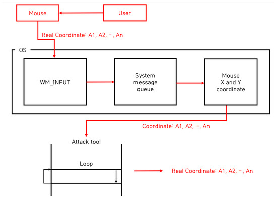 The process of transferring mouse data via the WM_INPUT message is explained in detail as follows. When the user moves the mouse, the mouse generates mouse data corresponding to the movement and transfers these data to the operating system. During this process, if the WM_INPUT message is registered from the application, the operating system sends the received mouse data to the handler of the application that registered the WM_INPUT message. The handler retrieves the mouse data received from the operating system, and the data are the relative coordinates on the screen. According to this transfer process, if an attacker registers a WM_INPUT message and periodically steals mouse data, the attacker can track the user’s mouse movement, and, therefore, the attacker can steal the user’s input authentication information using image-based authentication.