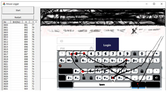 To describe the attack results shown in the figures, when the attacker clicks the “Start” button in the attack program to start the attack, the image displayed on the screen is captured and displayed on the right screen. Afterwards, when the user moves the mouse, the cursor moves accordingly, and the movement is visualized as a black line. By visualizing the results, the tracking of the user’s mouse movements was verified. From an attacker’s perspective, an important part of stealing user credentials is the user’s click information on the displayed screen, and the attacker program visualizes the user’s click information by displaying red dots and click order. The list box on the left shows the actual mouse location and click information in order, informing the attacker of the coordinates. Finally, the attacker uses the stolen password to authenticate as the user, using this attack program to steal the “boss123” password inputted by the user.