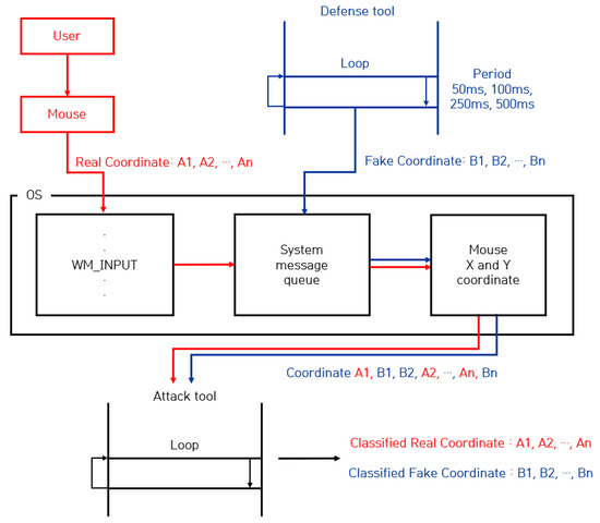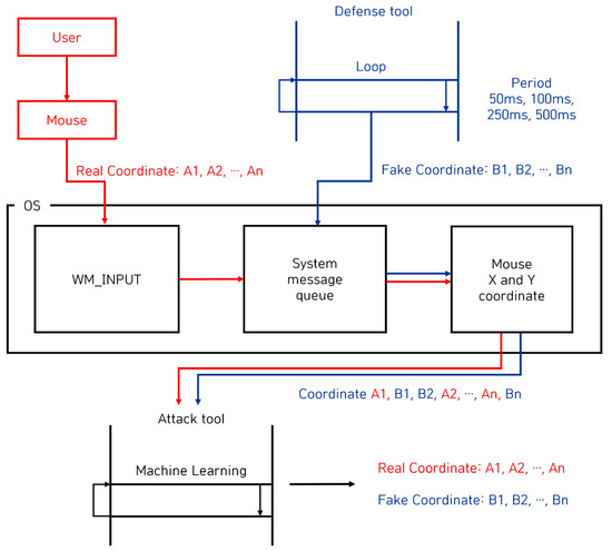 In this section, we describe a mouse data theft attack technique using machine learning when a mouse data defense technique using the WM_INPUT message is deployed. This attack technique aims to steal user’s real mouse data by classifying real mouse data and fake mouse data using machine learning, even if both real mouse data entered by the user and fake mouse data generated by the defense program are collected. To this end, the attack possibility was verified by configuring the attack system and datasets and evaluating its performance.