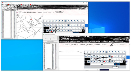 The attack technique using the WM_INPUT message that is the subject of the paper is an attack that continuously steals the mouse’s relative coordinates by registering the WM_INPUT message and tracks the user’s input mouse movement based on the collected relative coordinates. The tracking process is as follows. Once launched, the attack program captures the user’s screen and extracts the absolute coordinates of the current mouse position. Afterwards, the WM_INPUT message handler is registered, and if the user moves the mouse, the operating system calls the WM_INPUT message handler registered by the attack program. Accordingly, the attacker steals the relative coordinates of the current mouse position from the WM_INPUT message handler. Based on the initially extracted absolute coordinates, the mouse movement is tracked by calculating the stolen relative coordinates. This attack process is shown in Figure 2 [23]. The attacker tracks the user’s mouse input based on the attack process shown in Figure 2, and the attack results are shown in Figure 3 [23].