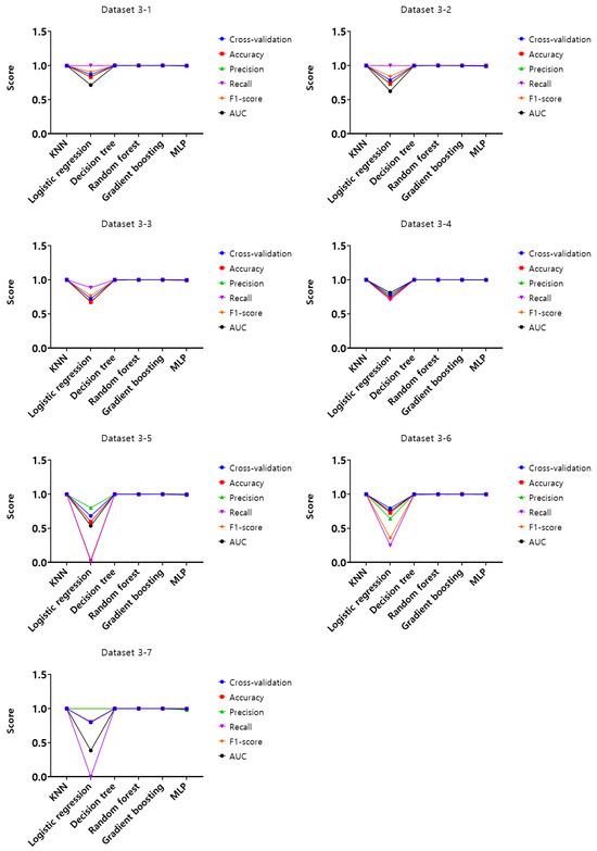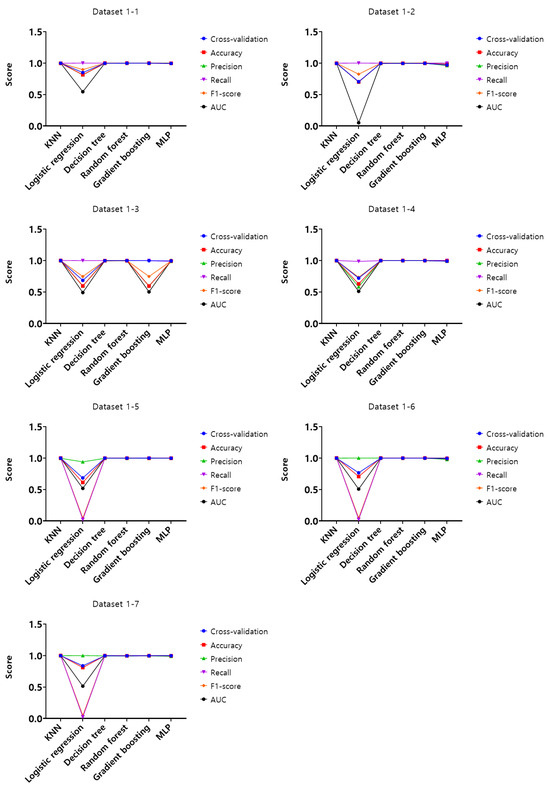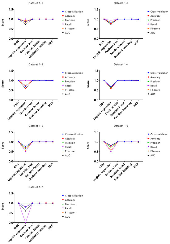 Analysis of the experimental results of dataset 1-1, KNN, random forest, and gradient boosting models showed the highest score of 1 according to the set of hyperparameters in the training set. In the validation set, KNN, decision tree, random forest, and gradient boosting models were found to have the highest score of 0.99, and lastly, in the test set, KNN, decision tree, random forest, and gradient boosting models showed the highest score of 0.99. Based on these results, the optimal hyperparameters were derived on dataset 1-1, and using these hyperparameters, cross-validation, accuracy, precision, recall, F1-score, and AUC were evaluated for the entire datasets from 1-1 to 4-7. The results are shown in Figure 7, Figure 8, Figure 9 and Figure 10.